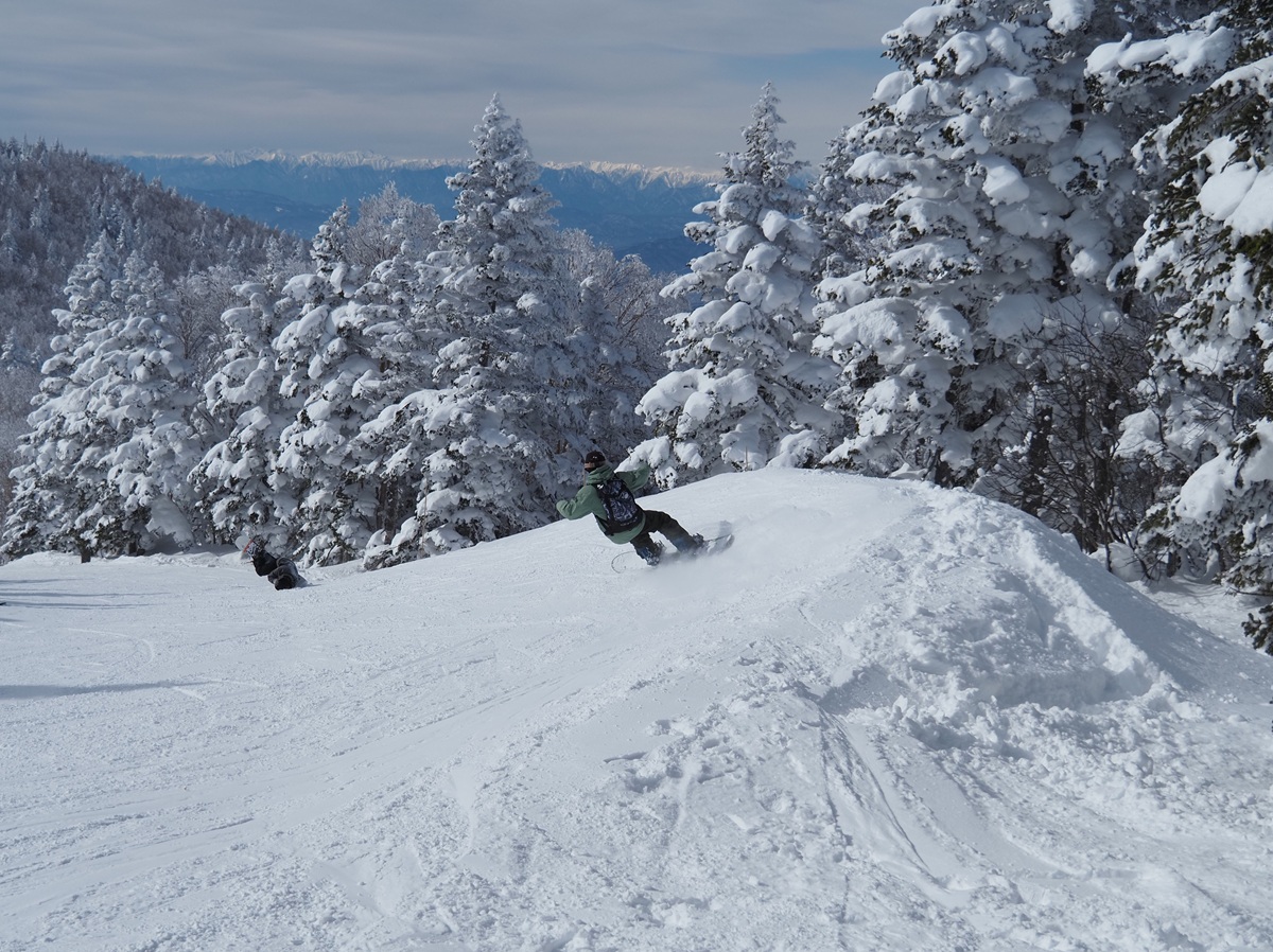 そしてゲレンデ上部はパウダー好きにはたまらない特別なエリア。名物「木落しコース」はパウダー好きには有名。ワイドバーンで、ステップアップにバッチリなパークが充実。