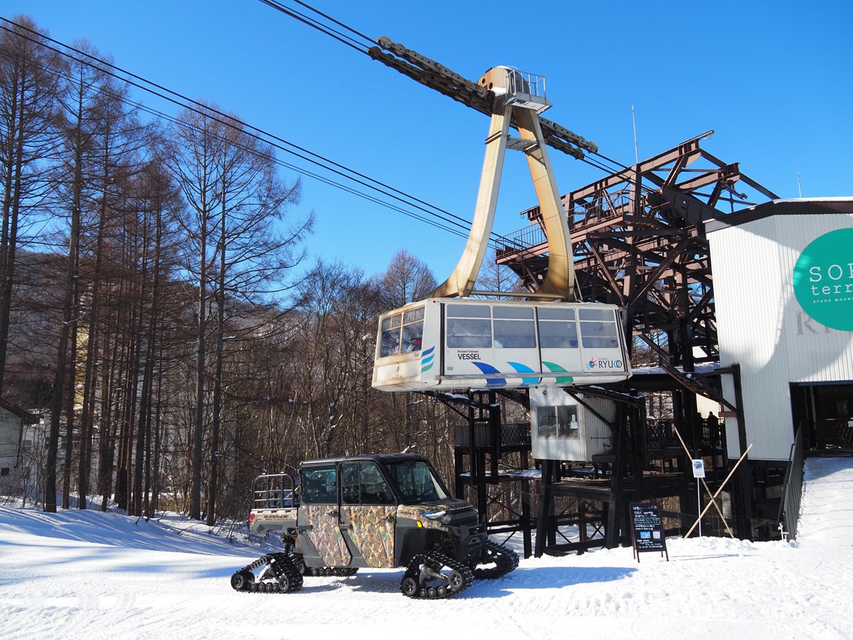 標高1,770mに建てられたSORA terraceからは、長野の雄大な雪景色と、北アルプスや日本海までの絶景を眺めることができる。時々日本海まで見渡せることができます。世界最大級ロープウェイに乗り約10分間の空中散歩で簡単に上がることができるので、ノンスキーヤーも多く訪れるスポットとなっている。