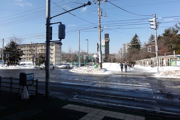 屋外へ出たら、目の前にある横断歩道を渡り、時計塔が見える方向へ直進。