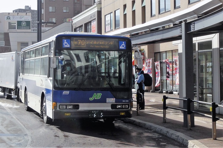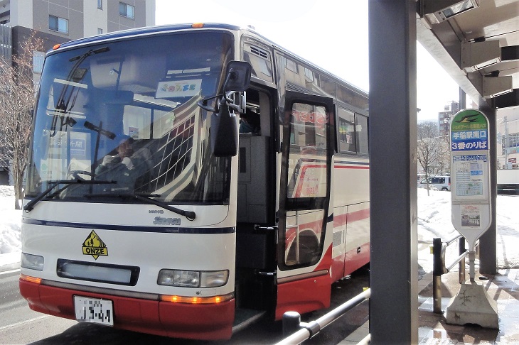 札幌市内に宿泊するならホテルの最寄駅次第で、大通駅から地下鉄で宮の沢駅に向かいバスに乗るか、札幌駅からJRで手稲駅へ向かいバスに乗るか、という行き方になります。手稲駅の乗り場は、この前に紹介をしたサッポロテイネのバス乗り場の近く、南口ミスタードーナツ付近です。