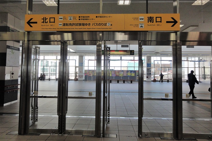 北出口の改札を出たら、目の前の扉から屋外へ。改札付近にはバス乗り場の案内がいくつか出ていますが、それらは別の路線の案内。札幌藻岩山スキー場へ行くバスの案内表示は出ていないので、案内表示は一切無視して目の前から屋外へ出ましょう。