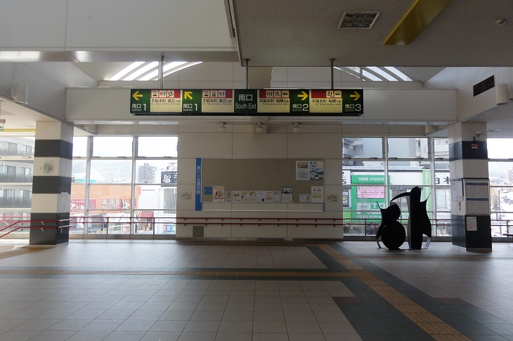 JR手稲駅の改札は地上2階。改札を出たら駅待合室の脇を通り過ぎ直進し、駅構内の扉の外に出たら南口と北口に分かれるので、右手の南口へ向かいます。