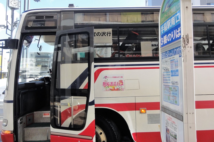 送迎バスはマイクロバスタイプ。観光バスも多数発着するので間違えないように。