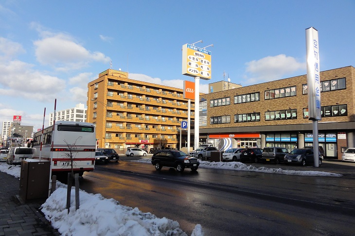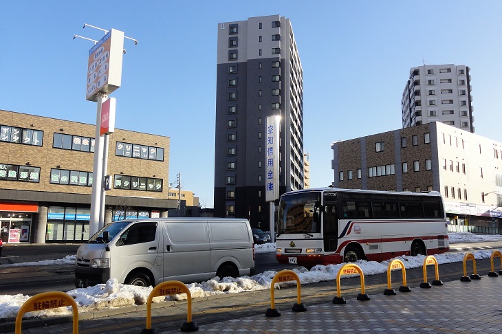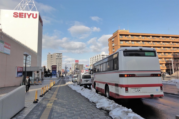 5番出口から地上に出たら、右にぐるりと回るように歩道を直進。上の写真では、出口を出たらまっすぐ先のほうに青いバスが見える方向へ進んでいきます。そのまま2、3分歩いていき、右手にあるスーパー「SEIYU」の入口前を通り過ぎ、道路向かいに「空知信用金庫」の看板があるところが乗降場所です。