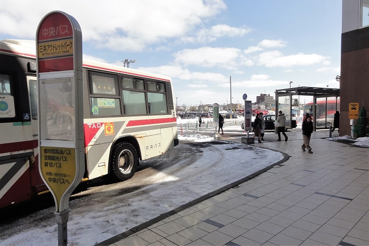 北広島駅は札幌駅と新千歳空港駅の間にあり、快速列車も停車。下車をして改札を出たら西出口1番の階段を下りて中央バス乗り場へ行き、バスに乗車したら約20分で三井アウトレットパーク 札幌北広島です。