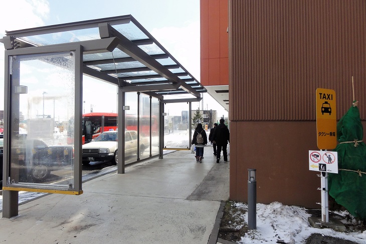 三井アウトレットパーク 札幌北広島で下車したら左手に進み、タクシー乗り場方面へ。タクシー乗り場を通り過ぎた先に、ダイナスティスキーリゾートへ向かう送迎バス乗り場があります。
