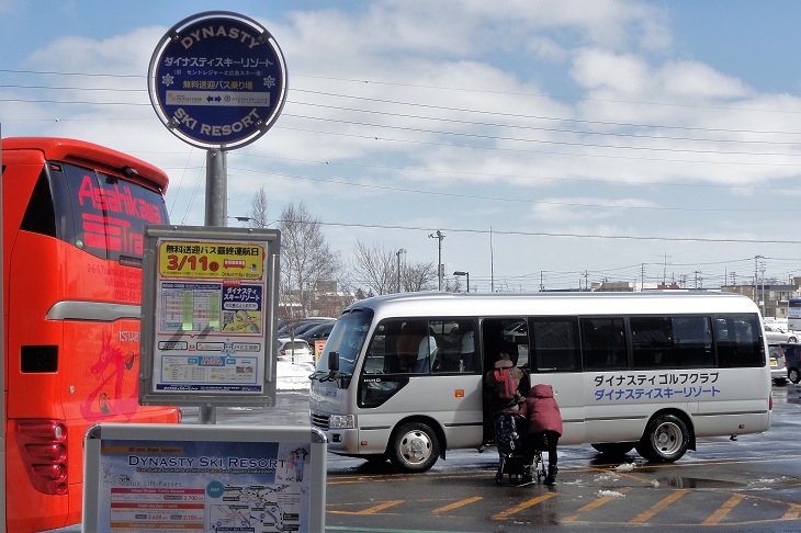 ダイナスティスキーリゾートへ行くには、アウトレットモールの「三井アウトレットパーク 札幌北広島」から発着している無料送迎バスを利用します。乗車時間は約10分です。無料送迎バスに乗るため三井アウトレットパーク 札幌北広島へ行くには、JR札幌駅やJR北広島駅、札幌市営地下鉄・東豊(とうほう)線の福住駅、同じく地下鉄東西線の大谷地駅など各地から路線バスを利用します。このほか、新千歳空港から札幌市街地を結ぶ空港連絡バスの一部が停車。空港からの所要時間は約30分、日中は概ね15分ごとに停車するので、空港からの行き帰りに利用するにも便利です。