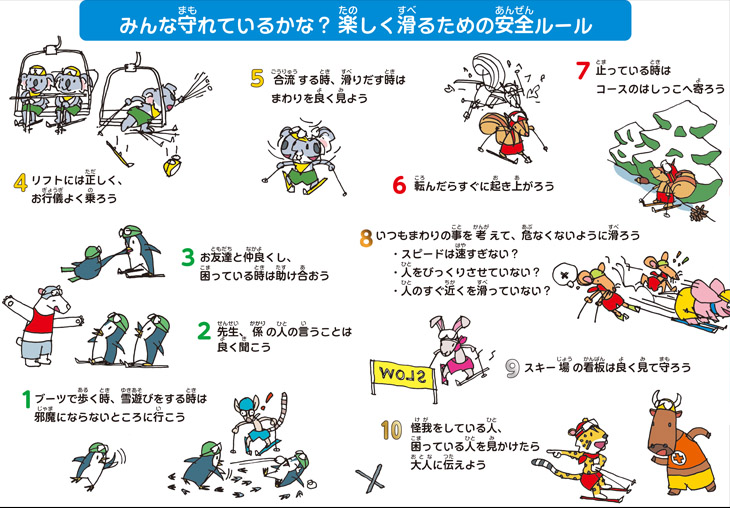 SIAが作成した「楽しく滑るための安全ルール」。動物のイラストを使ったわかりやすい説明が特徴。ビギナーのうちからマナーを気にかけるキッズは、上達だって早くなります!