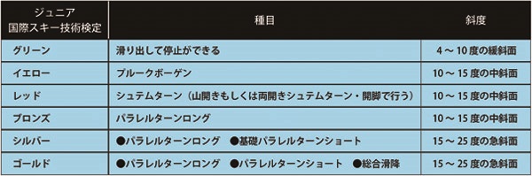 SIAでは国際スキー技術検定というものを行っています。この検定は、世界共通の基準(ISIAグローバルスタンダード)に基づいていて、それはSIAが国内唯一の「ISIA(国際スキー教師連盟)」加盟団体である点に関係しています。そしてこのジュニア版が「ジュニア国際スキー技術検定」です。中学生以下のジュニアスキーヤーを対象としたもので、ランクはゴールド、シルバー、ブロンズ、レッド、イエロー、グリーンの6種類。ターン全体のスムーズさやスピードコントロール、ボディコントロールなどが着眼点となるのは大人の検定と同じですが、ターン中にパラレルがシュテム状になったりすることは、あまり問題視されません。むしろスタートからゴールまで安定したリズムでターンを継続することがポイントです。検定日などはとくに定められておらず、検定資格をもつ教師さえいれば随時実施できるのも特色です。また修学旅行やスキー林間学校などの行事に取り入れる小中学校も増えているそうです。SIAのオフィシャルホームページに掲載されている要項を参考にして、各ランクの内容を見てみましょう。