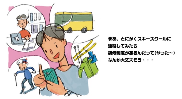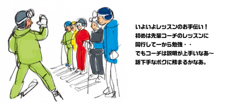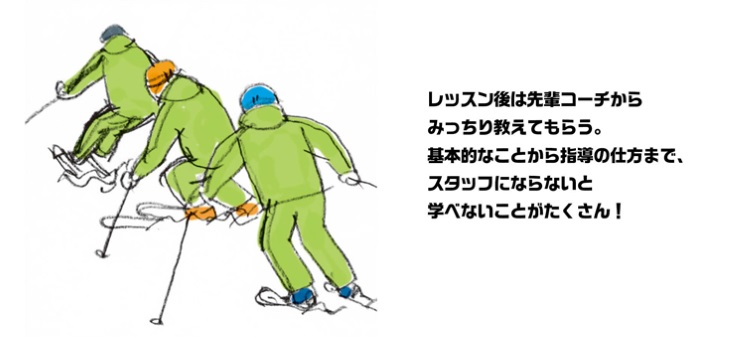 一般的にスキースクールのアシスタントや研修生になるためには、一定の技術を持っていることが求められていますが、それは決して高いものではありません。多くのスキースクールでは、国際スキー技術検定シルバーもしくはSAJ2級程度を採用条件としているところが多いようですが、これらはあくまで基準であり、本人の「やる気」しだいで緩和されることも少なくないようです。また、インストラクターは自分の上手さをひけらかす仕事ではありません。スクール入校者に対し、上達への適切な道筋を示してあげることが何よりも大切です。