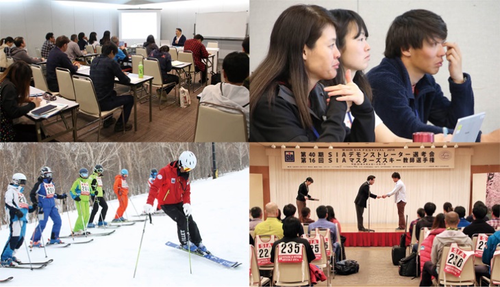 検定会の様子。学科ではSIAオフィシャルスキー&スノーボードメソッドをベースにしながらプロ教師として活躍するための幅広い知識を、雪上では指導種目や技術表現、また実技試験合格のためのポイントを学びます。