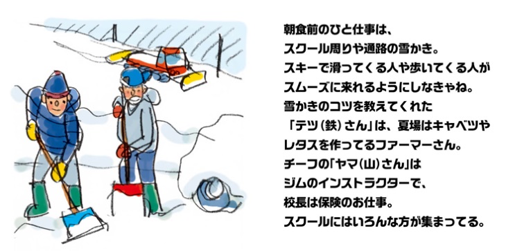 スクールのスタッフは自宅から通っている人もいれば、寮や宿舎(スクールが常駐するホテルの場合もある)に寝泊まりしている人もいます。自宅がスキー場の近くという場合を除いて、ほとんどは寮や宿舎にお世話になることでしょう。団体生活ですからルールやマナーをきちんと守る必要がありますが、志を同じくする者どうし、貴重な体験となるはずです。先輩達からの何気ない言葉が大きなヒントになったり、スタッフの一員として生活するすべての時間が、インストラクターとしてのスキルを育ててくれます。