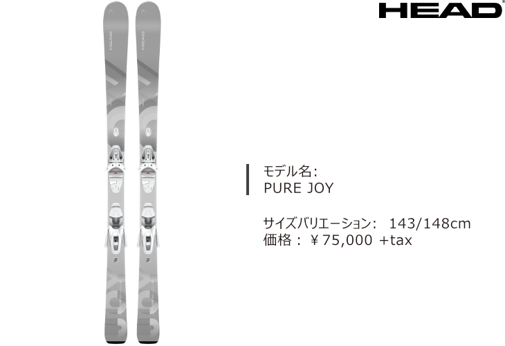 HEAD JOYシリーズは、女性がJOYな気分になれるよう女性がエンジニアリングした女性専用スキー。スキー自体も軽量化されているが、滑走時にもスキーが軽快に動くので気持ちよくスキーが楽しめる。少ない力でスキーがキレイにたわみ、気持ちのよいカービングターンが刻めるモデル。