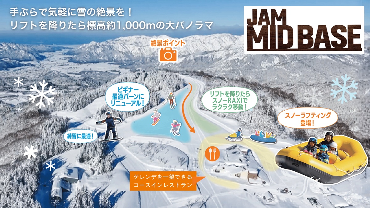 シーズン中にオープン予定の新エリア「JAM MID BASE」は、今季の注目スポット。リフトを降りれば標高約1,000mの眺望が広がり、ビギナー最適なバーンにリニューアル。ゲレンデを一望できるコースインレストラン、人気のスノーラフティング、滑らなくても移動できるスノーRAXIなど、初心者からノンスキーヤーまで楽しめる工夫が満載です。