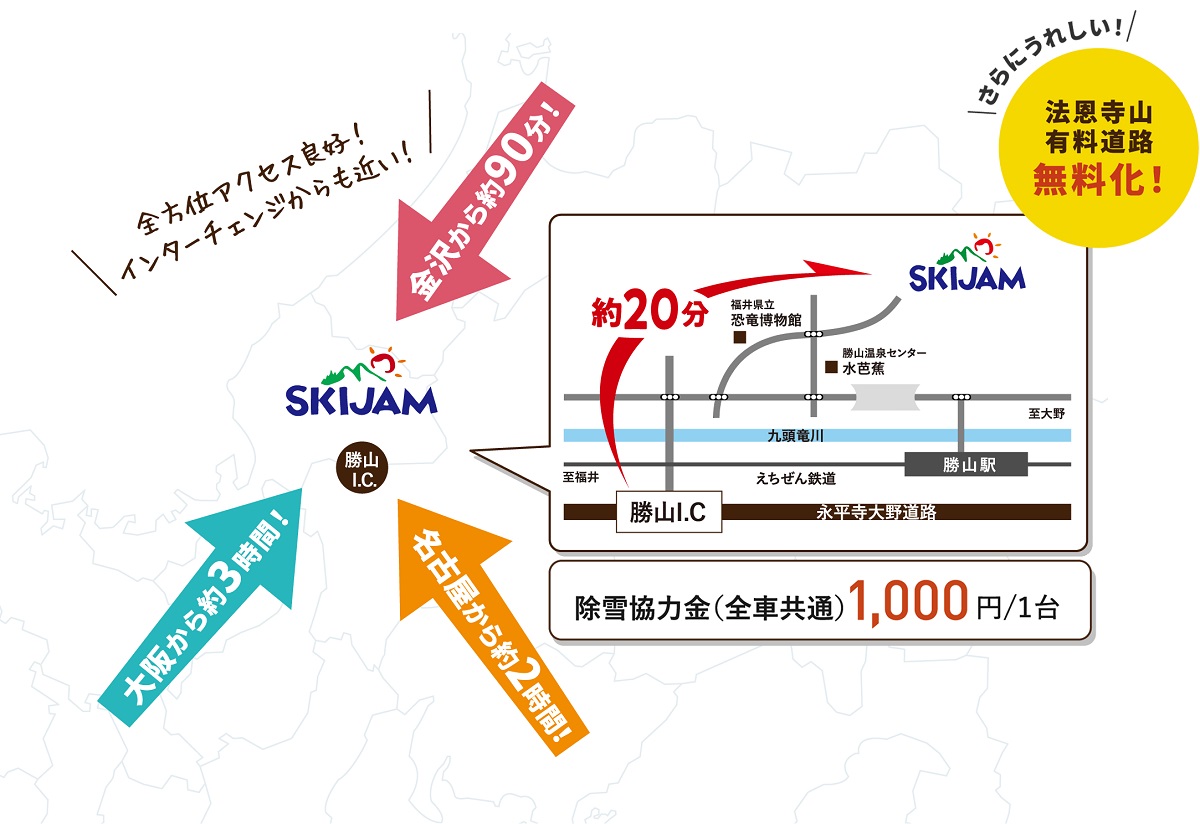 車だと、金沢から約90分、名古屋から約2時間、大阪からでも約3時間で到着。北陸道 福井北JCTから中部縦貫道に入り、勝山ICを降りたら約20分のカンタンアクセス。おまけにスキー場手前の法恩寺山有料道路が無料化になったのも嬉しいニュースだ。
