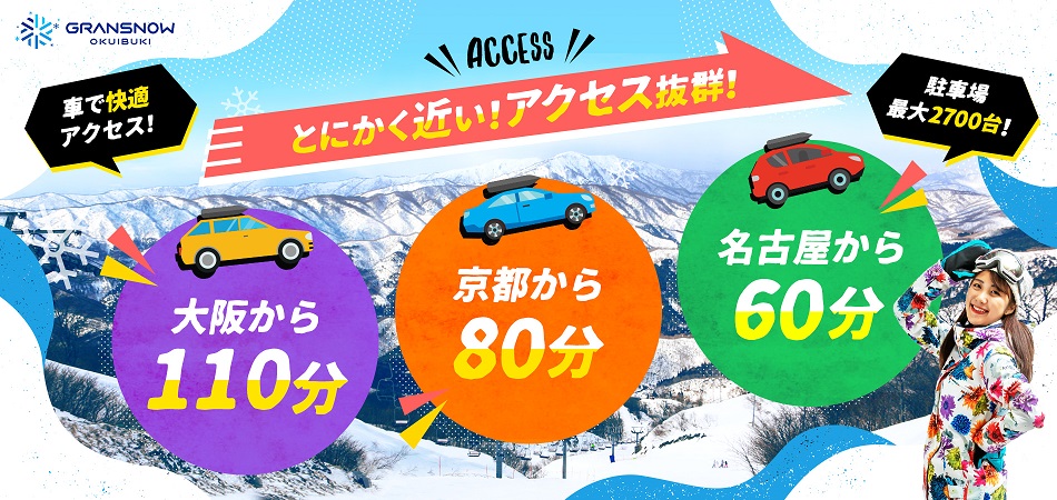 近い! 大阪から100分、京都から80分、名古屋から60分! <グランスノー奥伊吹>