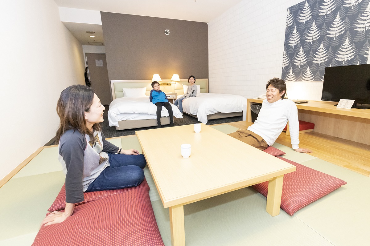 タングラムスキーサーカスのゲレンデベースに立つ宿泊施設が「ホテルタングラム」。スキーセンターとホテルが一体化しており、滑る環境としては申し分ありません。客室は、スタンダード洋室タイプの他にも、家族向けの「わくわくしつ」、広々としたプレミアムツイン、和室を組み合わせた和洋室、現代風にアレンジしたモダン和室など様々なタイプを用意。レストランはバイキング「ZIGZAG」、コース料理「ル・タングラム」などがあり、温泉大浴場・露天風呂、室内プール、リラクゼーションも完備。愛犬、愛猫と一緒に泊まれるペット対応ルームもあります。