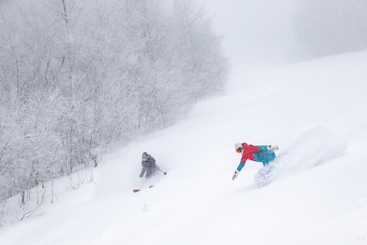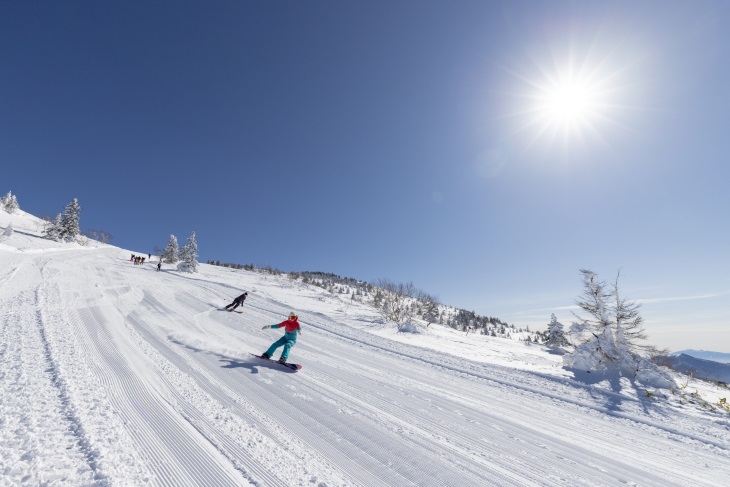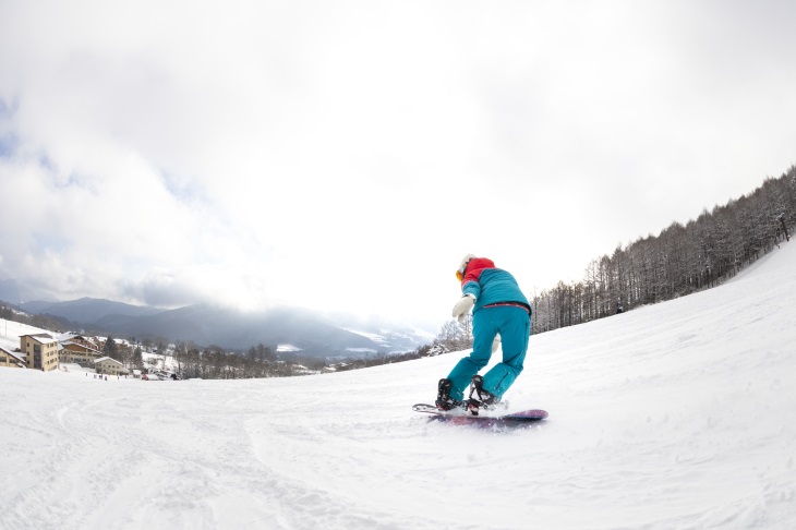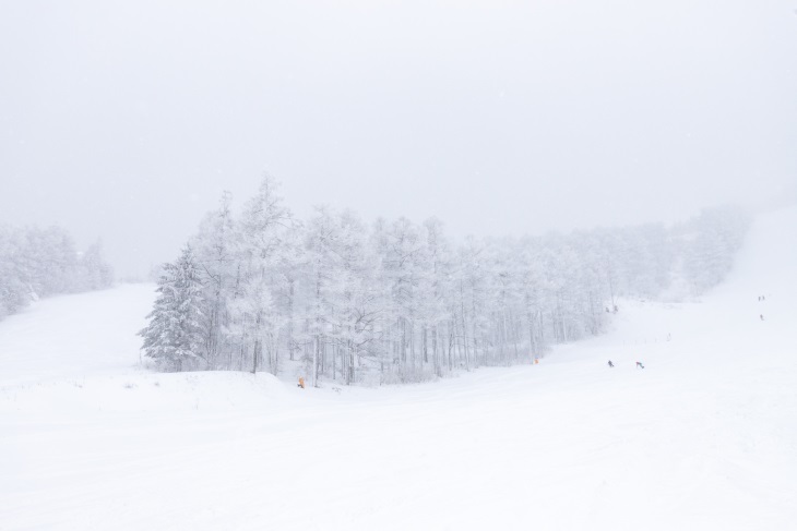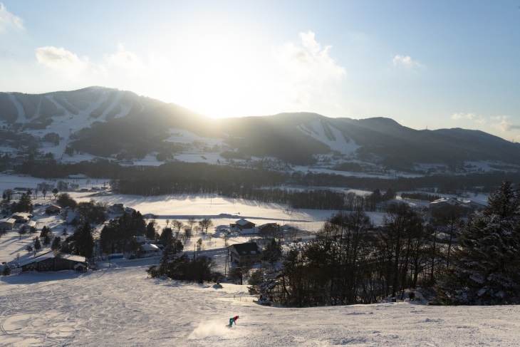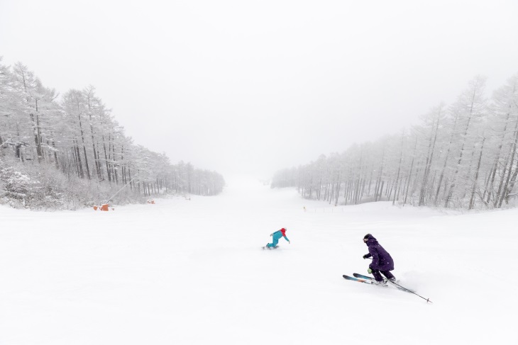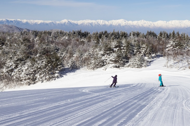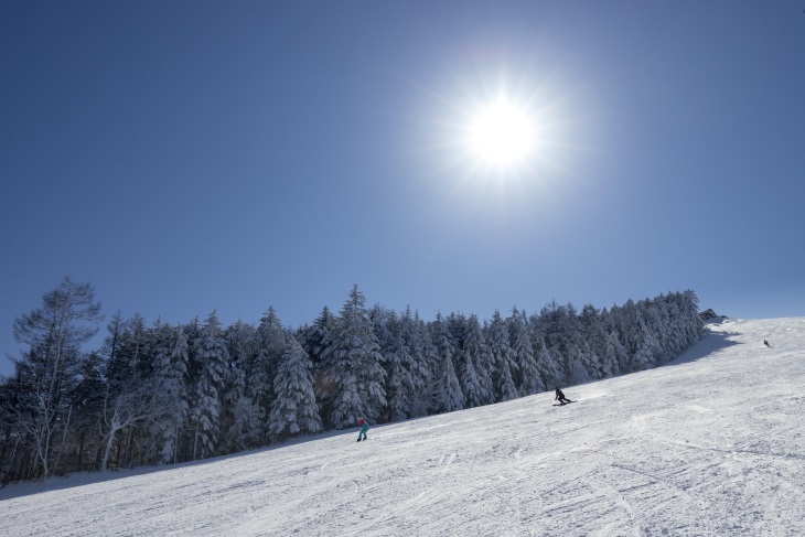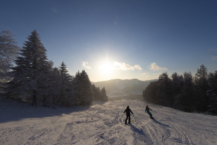菅平高原はベースで標高が1250mあり、内陸で気温が低いエリアであることから、降り積もる雪は極上。しかもコース整備に定評のある菅平高原。主なコースは夜明け前のタイミングでコース整備を入れるので、その上に降り積もったパウダーであれば、その滑りやすさ、気持ちよさは言わずもがな、だ。