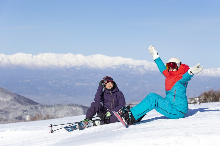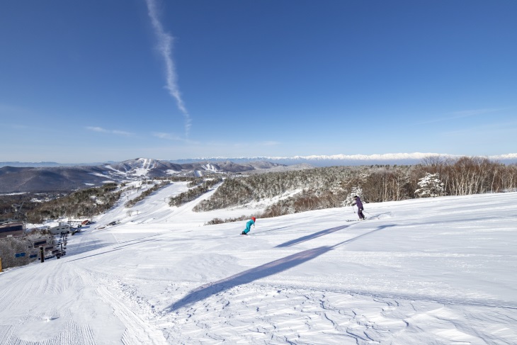 大きな空と北アルプスなどの大パノラマ、そして眼下には菅平高原スノーリゾートの素晴らしい眺望を楽しみながら、下山滑走スタート。整地された滑走ルートを基本的に滑っていき、奥ダボスゲレンデ下部まで滑りきると合計で約4kmのダウンヒルを楽しむことができるのだ。