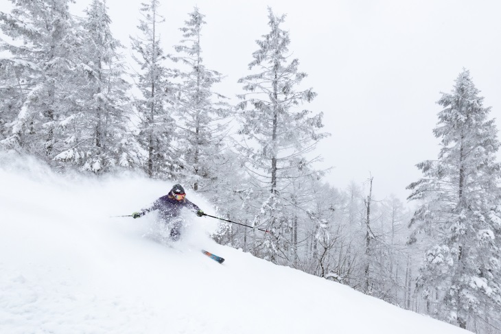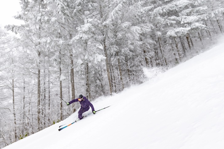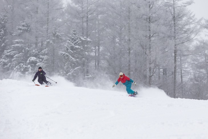 菅平高原の各コースは幅の広さも魅力。パウダーでもパウダーでなくても、気持ちの良いスピードに乗った大きなターン弧で滑る快感は、一度味わったら病みつきになるに違いない。