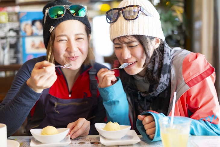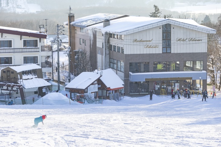 たくさん滑ってお腹が減ってきたこともあって、2人は白金ゲレンデのベースにあるレストラン「シュワルツ」へ。