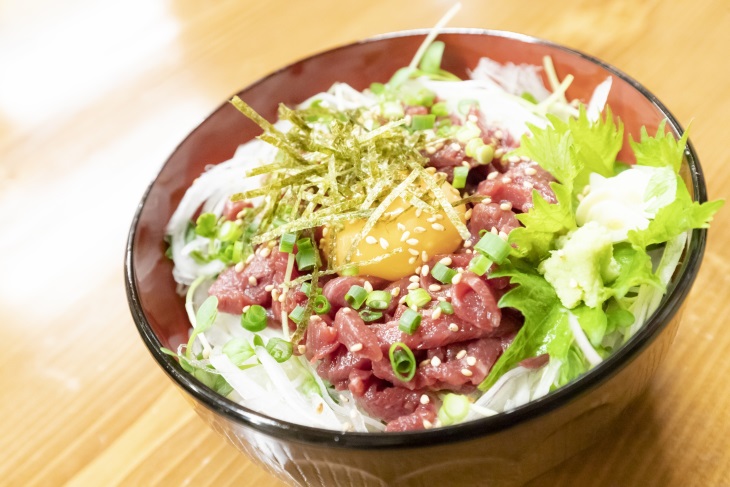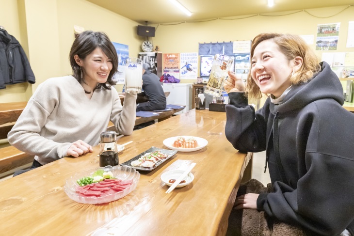 居酒屋「月の輪」は、メニューが豊富で地元の人やスキー場&スクール関係者たちも利用している。人気の高い裏メニュー(?)で馬刺しユッケ丼などもおすすめだ。