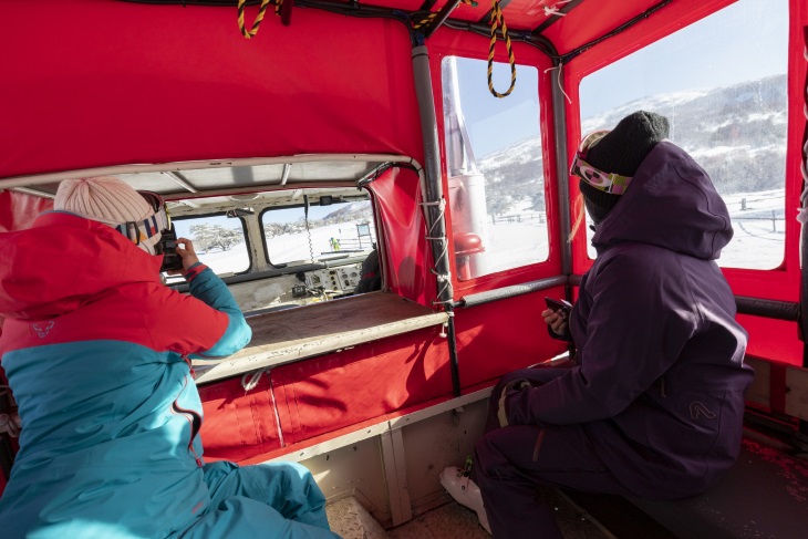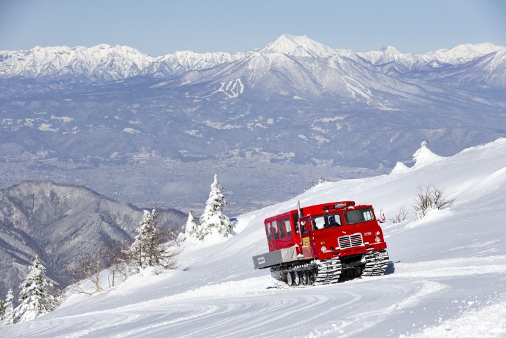 朝イチから、これぞ「菅平ブルー」という感じの青空が広がっている時は、迷わず「スノーキャット」だ。ダボスエリアにある奥ダボス第1トリプルリフト降り場前が受付&スタート地点となる。赤いキャット(雪上車)に乗車し、根子岳の標高2170mまで、およそ25分で運んでくれるのだ。料金は大人3300円(中学生以上)、子供1800円となっている。