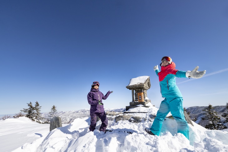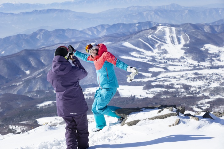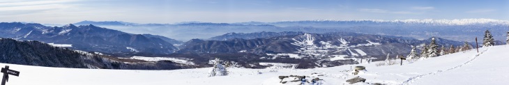 山頂では目前に四阿山が迫り、富士山に浅間山、常念岳、槍ヶ岳に鹿島槍ヶ岳や五竜岳、白馬岳といった北アルプスからの妙高山や黒姫山、飯縄山、戸隠山といった北信を代表する山々まで、たくさんの名山をぐるりと見渡せる大パノラマが待っている。眼下には菅平高原スノーリゾートを一望することができるのだ。