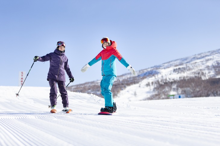超ワイドな斜面で空の青と雪面の白のコントラストが最高。素晴らしい景色を眺めながら、ゆっくりと斜面を愛でるように滑る楽しさを満喫した2人は、前日に滑ることができなかった太郎エリアのコースへ。