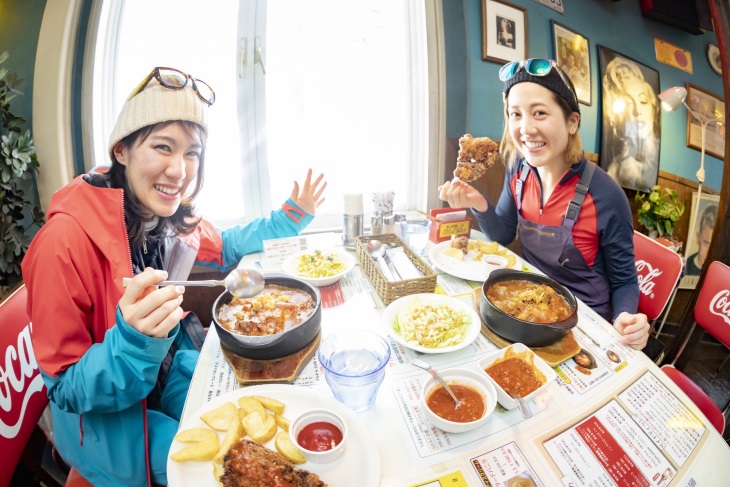 気温の低い菅平高原ではランチで身体を温めたいと、知る人ぞ知る、カレーの激戦区とも言われている(謎)。ということで、今日も2人が選んだランチはカレー(笑)。店の入り口前に巨大な看板で“名物 焼きカレー”と書いてある「メルス」の店内に入ると、ここで本当に美味しいカレーが食べられるのかと疑ってしまうほど、70年代のアメリカーン風の内装に、2人ともちょっとびっくり。