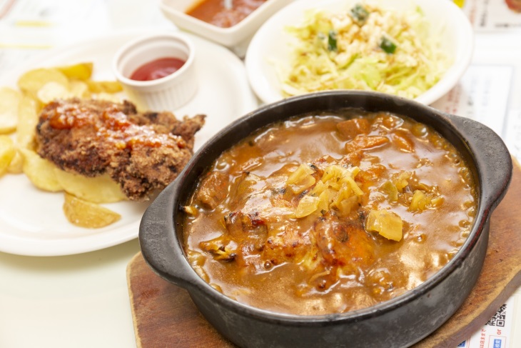 しかし焼きカレーの美味しさは、表の看板に偽りなく、2人は地元上田産の若鶏を使用した極み揚げ鶏とサラダとのセットを注文し、今日もボリュームも満点。焼きカレーはソテーライスの上にポテトとキャベル、チーズを乗せ、その上に熟成ポークカレーをかけて焼き上げた逸品。焼きカレーにはトッピングでナスかトマトを選ぶことができ、熱々の状態でテーブルに運ばれてくる。当然、ハフハフ必至だが、あっという間にペロリとたいらげ、デザートのカスタードアイスも追加でオーダー。