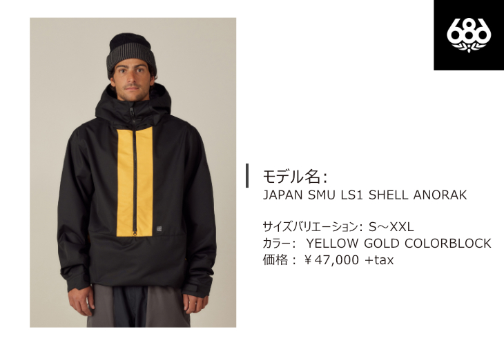686JAPANが新たに提案する、日本のトレンドに合わせたJAPAN SMUライン。シンプルで合わせやすいデザインで、バギーシルエットにもスタンダードなシルエットにも合うアノラックとなっている。短めのフィット感で汎用性が高く、フロントの2WAYジッパーは体温調整をするベンチレーションとしても機能。パッキングする際に便利なフードリンクや左袖にあるスリーブパスポケット、雪の侵入を防ぐ為にパンツと連結して使用するパウダースカート+PJコネクトシステムなど、機能面も充実している。25-26シーズン一押しのアノラック。