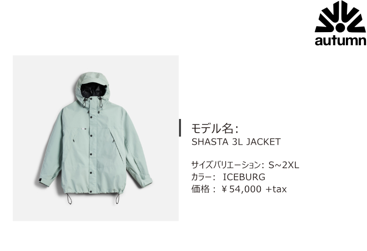 ミニマルなデザインの中に、スノーウェアとして必要な機能を詰め込んだジャケット。3層生地を使用し耐水圧、透湿性共に20Kを誇る。裾部分のドローコードを絞って着ることを推奨している為、あえてパウダースカートをつけていない。