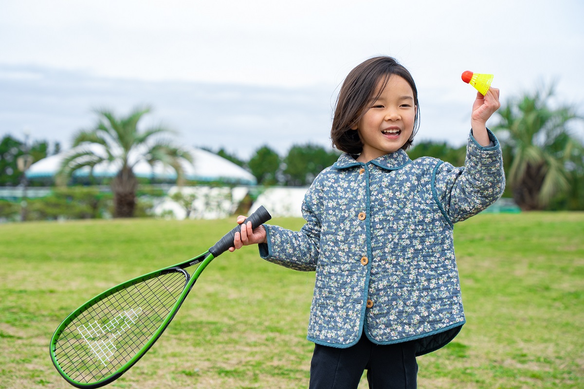 初めてのバトミントンに楽しそうなえむちゃん(5歳)