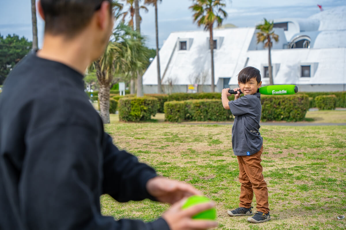 WBCも見ていたというけんしん君は、お父さんがトスしたボールをたくさんバットに当てて楽しんでいた