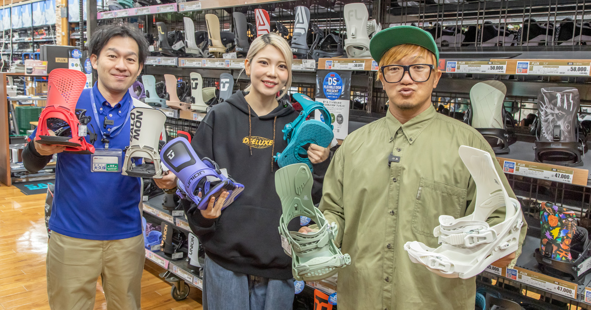 初心者には悩ましいスノーボードの道具選びを、「ちゃらトリ」でおなじみのラマ先生がスーパースポーツゼビオを舞台にインスタグラマーのiam SAKIとレクチャーするこの企画。今回は、ブーツとボードをつなぐインターフェイスであるビンディング選びのいろはを伝授。意外と知られていないビンディングの底力と、ベストなアイテムを選びための知識をお届けしよう。