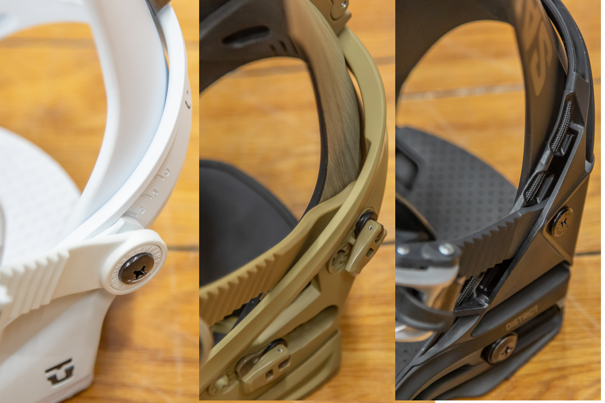 幅の太さや素材の違いで、締め心地は大きく異なり、ブーツとのマッチングにも関係する。ストラップタイプのビンディングも、よく見るとメーカーやモデルごとにストラップの形状や素材、硬さなどが異なることがわかる。ストラップが硬いと安定感を感じ、柔らかい素材だとフィット感を感じることができる。