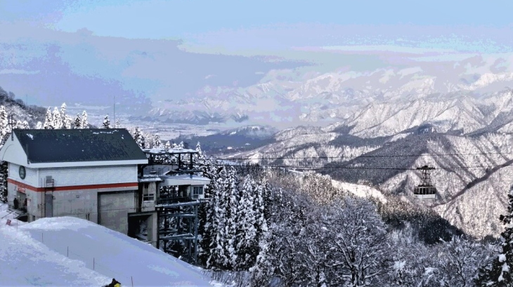 ロープウェイは、山ろくエリアの「湯沢温泉スノーワールド」と主な滑走エリアとなる「高原エリア」をつないでいます。