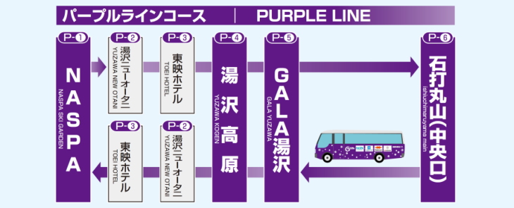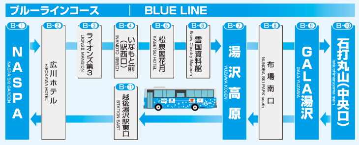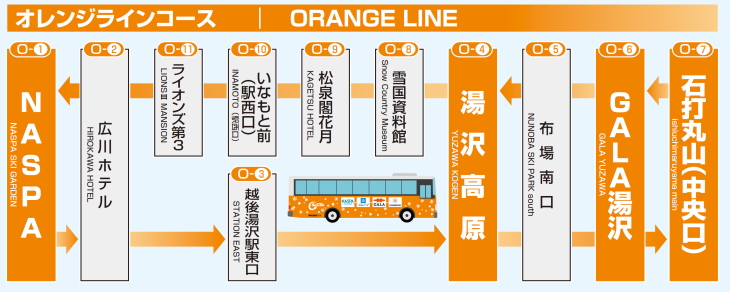 どの路線に乗っても湯沢高原スキー場、GALA湯沢スキー場、石打丸山スキー場間を移動することが可能です(路線により上記のスキー場以外の停車箇所が異なります)。