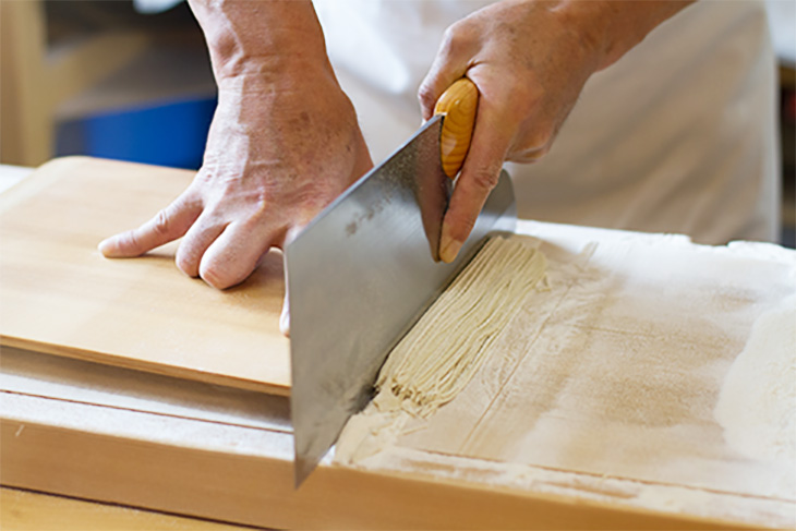 地元産の蕎麦の実を石臼で引いた粉を使っているだけあって、そばの風味をしっかりと感じることができ、細切りのそばはのどごしを楽しめる。このあたりには建物が密集していないため、北アルプスの眺望を眺めるにも最高だ。