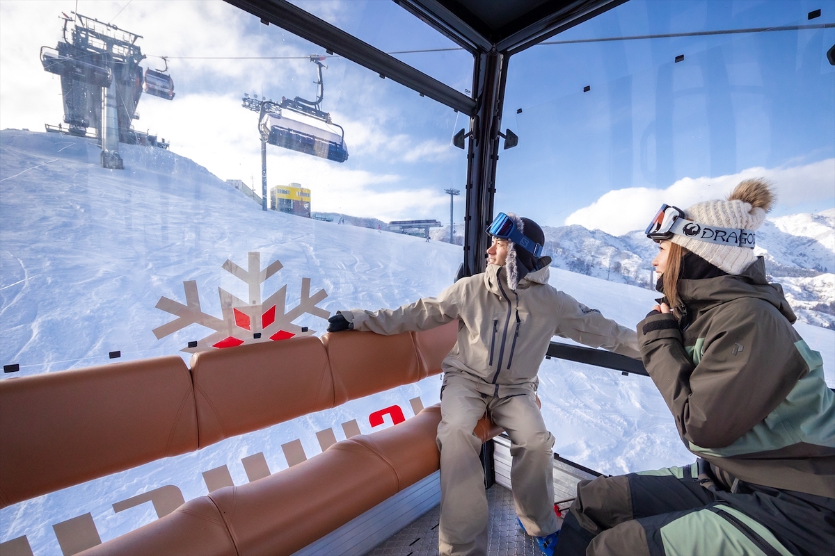 10人乗車できるゴンドラ内はとても広く、窓が大きいので乗車中の眺望も抜群。小さな子供のいるファミリーやスキーやスノーボードをしない人でも楽しく利用できるのがうれしいポイント。