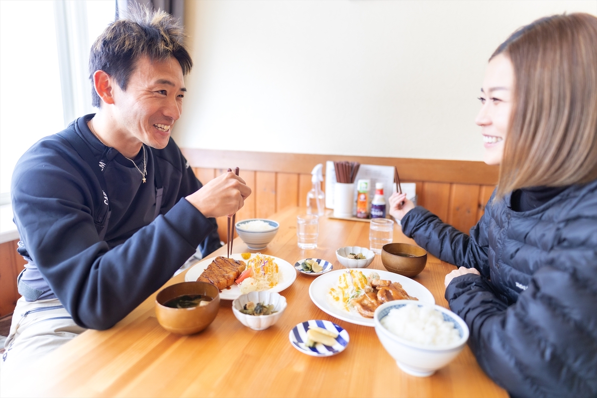 たくさん滑ってランチはガッツリ食べたいという人も、石打丸山スキー場内にはさまざまな特徴のあるメニューを揃えたレストランがたくさんあるので、どこを選んでも間違いなし。今回はザ・ヴェランダ石打丸山の上部にある「モンブラン」をチョイス。各種定食や麺類、一品料理、スイーツとどれを選んでも大満足確定。定食のご飯を大盛で注文しても、もちろん問題なしのメニューを揃えている。