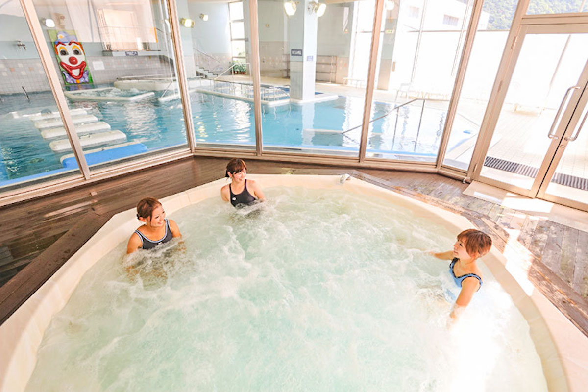 温泉やプールも併設。帰りの新幹線の乗車前に汗を流し、疲れを癒して帰ることも可能だ。
