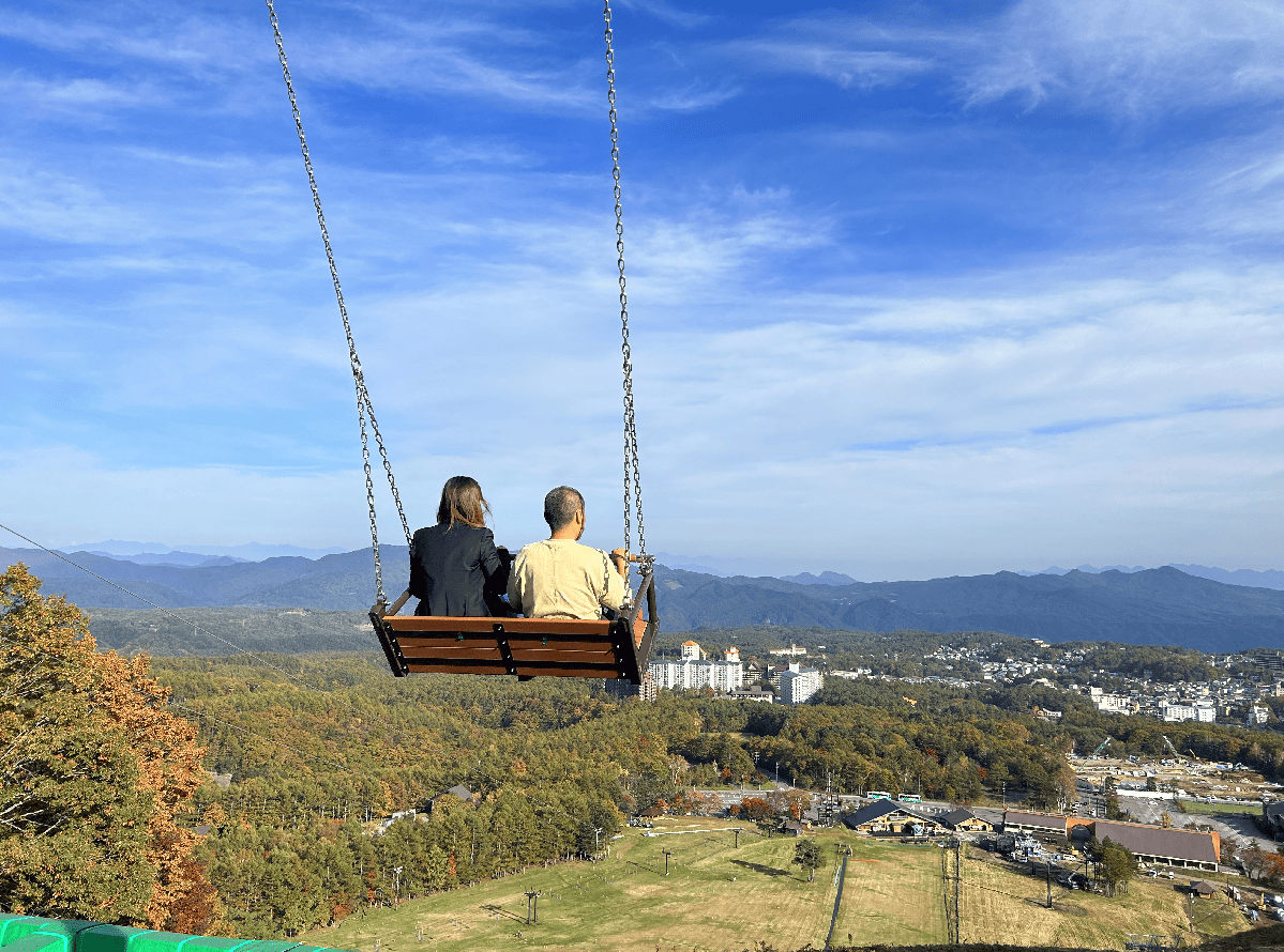 テラスから楽しめる紅葉と絶景のパノラマはもちろんのこと、通年で利用できるアクティビティやドッグラン、バリエーション豊富なレストランなど見どころが充実している草津温泉スキー場。関東最長500メートルのジップライン「BanZip TENGU」や日本一のっぽブランコ「SKY SWING」などのアクティビティで、秋の爽やかな空気の中でスリル満点の体験ができます。