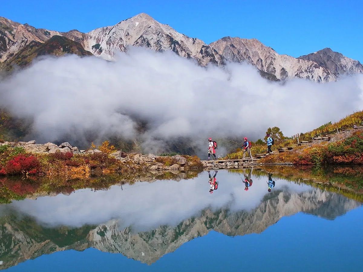 最大の魅力は、初雪が降る頃に見られる「白馬三段紅葉」です。雪をまとった山頂の白色、中腹の紅葉の赤色、麓の針葉樹の緑色と色が分かれる奇跡の絶景は、めったに見られない貴重な光景。八方アルペンラインでゴンドラとリフトを乗り継いで行く、八方池に映る白馬連峰の姿は息をのむ美しさです。