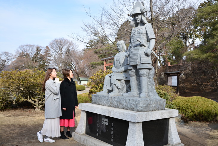 園内にある、真田氏の初代城主・真田信之と、その正室・小松姫の像。戦国時代を生き抜いた信之は、長寿で93歳まで生きたという。妻の小松姫は、徳川家の有力な家臣・本多忠勝の娘だ。