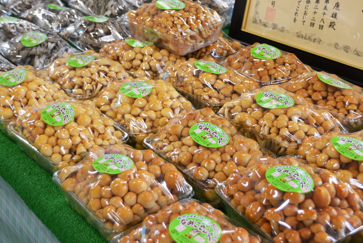 店を訪れると無料のなめこ汁をふるまってくれる。大ぶりのなめこは食感がよく、とろみも市販のものとはひとあじ違う。みそ汁に使われている自家製の味噌も店内で売られており、そのおいしさに感動して、きのことともに購入する人も多い。ほかにも、山菜や農産物、乾物、手作りのまんじゅうなど、さまざまな特産物が手に入る。