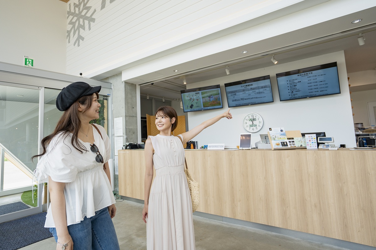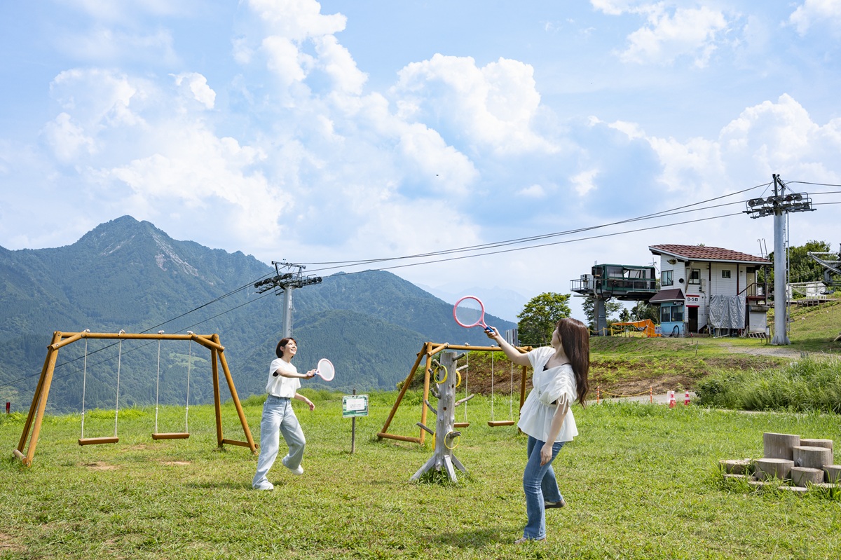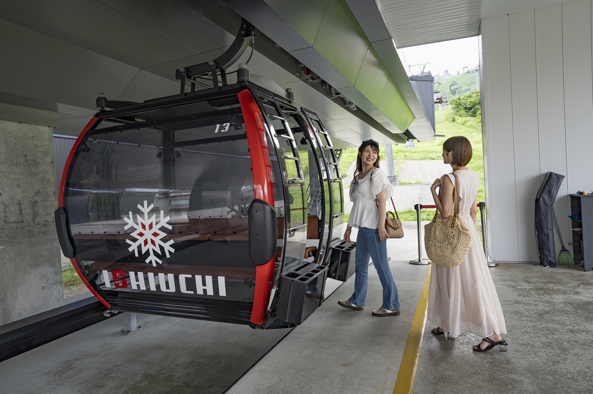 ザ・ヴェランダ石打丸山は、標高約550mのゲレンデ中腹に位置し、世界最新鋭のコンビリフト「サンライズエクスプレス」でアクセスできるリゾート施設です。その最大の魅力は、魚沼平野や越後三山、巻機山などの壮大な山々を見渡せる展望テラスからの眺望にあります。テラスにはカフェが併設され、屋外にはゆったりとくつろげるソファ席が配置されており、開放的な空間で心ゆくまで絶景を堪能できます。グリーンシーズンの澄んだ空気の中、心地よい風を感じながら過ごす時間は格別です。