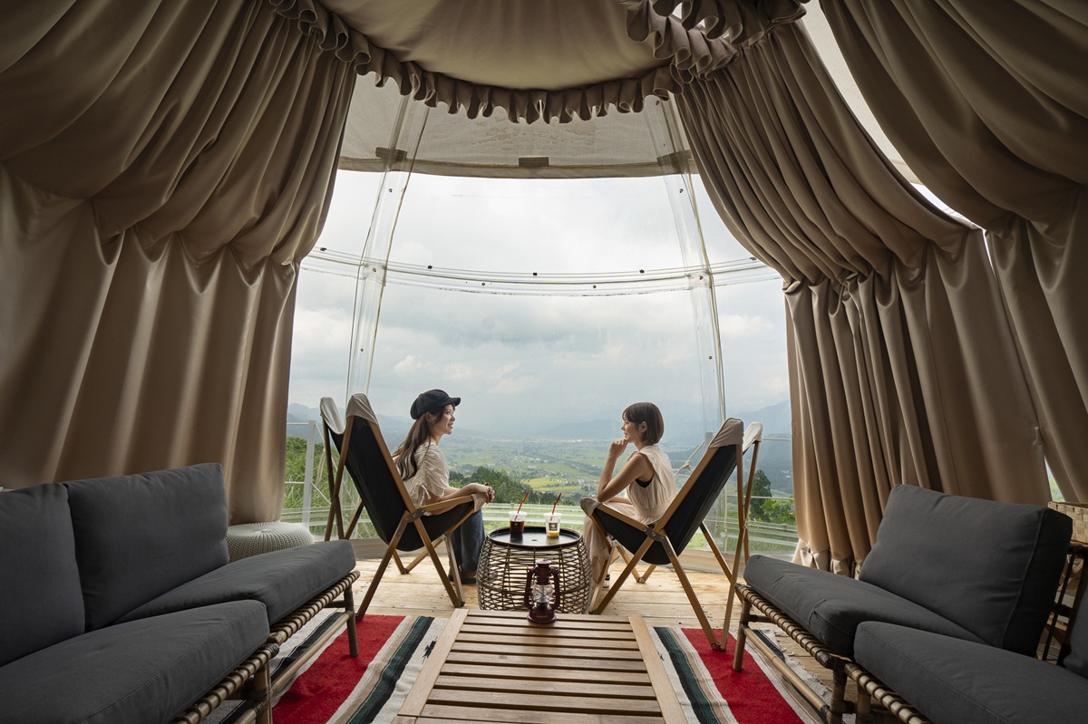温かい光に包まれたドームテント内は、昼間とは一変してロマンチックな雰囲気に満ちています。ドームテントの中から、眼下に広がる夜景を眺めながら、プライベートな時間を過ごせます。静かな夜の空気と美しい光景の中で、家族や友人と語らったり、カップルで寄り添ったりする時間は、忘れられない特別な思い出になるでしょう。