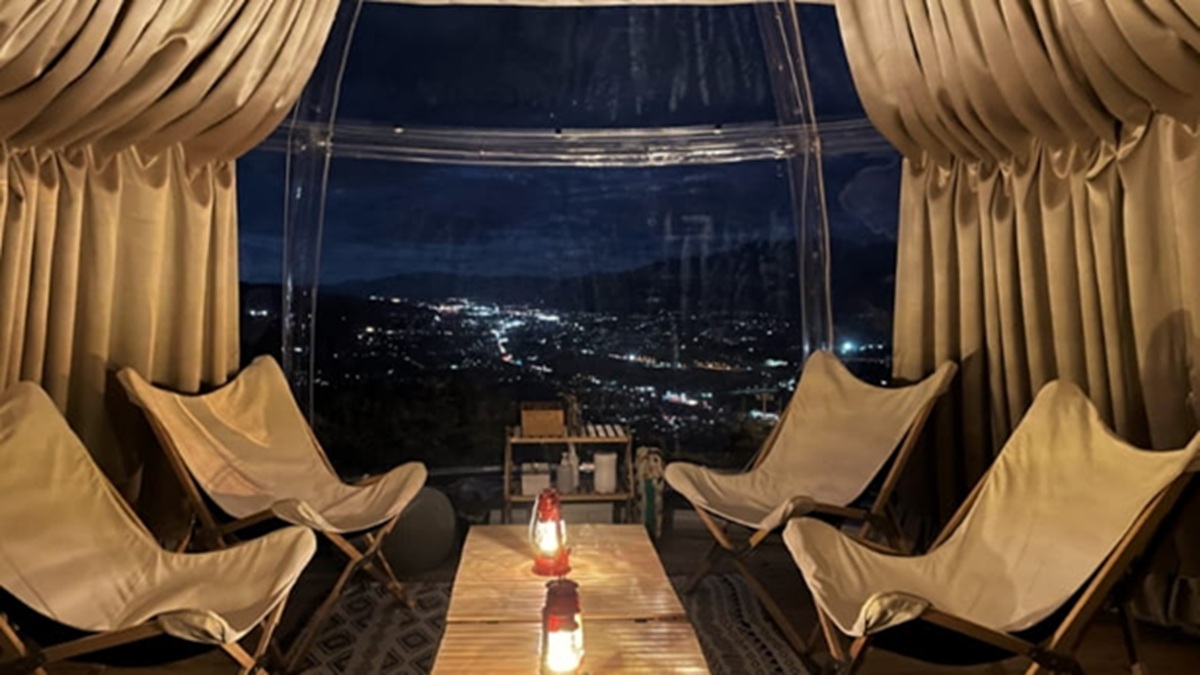 夜になると、展望テラスに設置されたドームテントが優しくライトアップされ、幻想的な空間を創り出します。